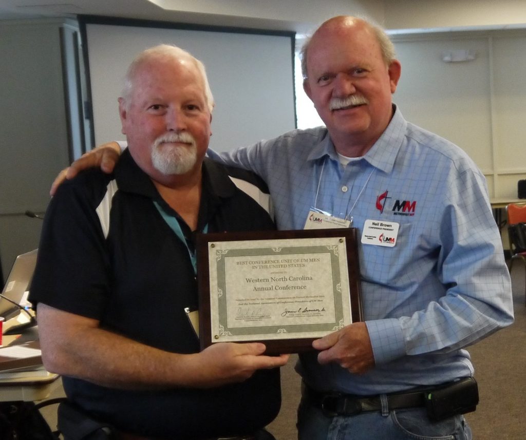 Neil Brown, conference president (right), receiving the award for “Best Conference Unit of United Methodist Men in the United States” on March 3, 2017 from Dan Ramsey (left), past national president at the annual meeting in Nashville, Tenn. The WNCC-UMM is a 2-time consecutive year winner of this national award.